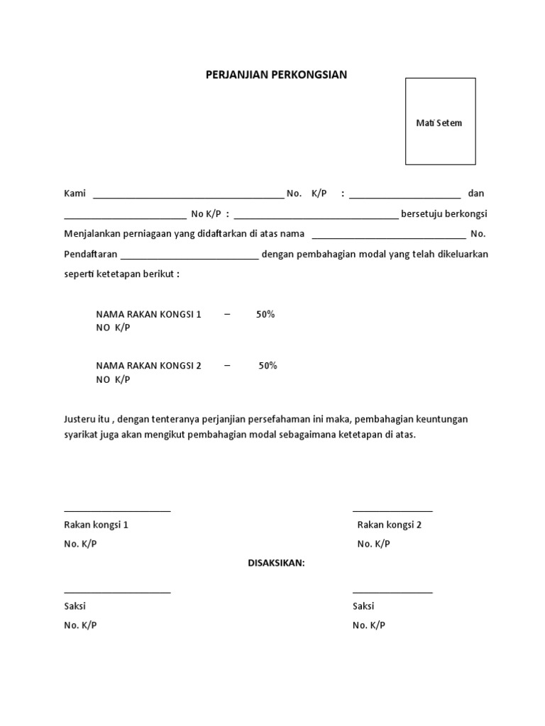 Berbeda dengan perjanjian yang dibuat secara tertulis, dimana sudah jelas tertulis mengenai peran dan tanggung jawab dari kedua belah pihak. Yang mudah untuk di edit, hanya cukup mengkopi nya dan di paste di micosoft word. Ketika dua orang atau 2 instansi melakukan kesepakatan. Please fill this form, we will try to respond as soon as possible. Surat perjanjian bagi (perkongsian perniagaan) perjanjian ini diperbuat pada….