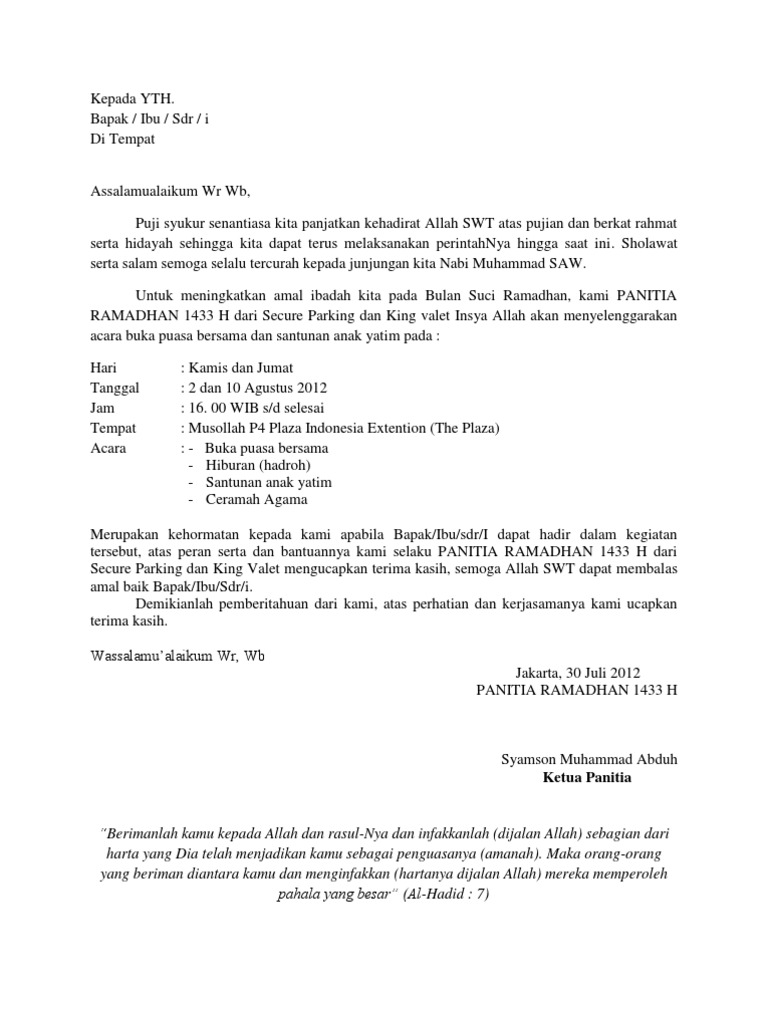 Sk panitia santunan anak yatim 1439 h. Assalamu alaikum wr wb kepada yth taman cikarang indah 1. Memberikan santunan anak yatim sering menjadi pilihan masyarakat dalam berbagi rezeki kepada sesama. Arti menanggung anak yatim adalah mengurusi dan memperhatikan semua keperluan. Doa sebelum kami undur diri, kami atas nama pembawa acara dan panitia pelaksana mengucapkan banyak terima kasih atas perhatian dan kebersamaannya.